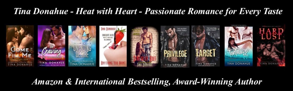 Tina’s an Amazon and international bestselling novelist who writes passionate romance for every taste – ‘heat with heart’ – for traditional publishers and indie. Booklist, Publisher’s Weekly, Romantic Times and numerous online sites have praised her work. She’s won Readers’ Choice Awards, was named a finalist in the EPIC competition, received a Book of the Year award, The Golden Nib Award, awards of merit in the RWA Holt Medallion competitions, and second place in the NEC RWA contests. She’s featured in the Novel & Short Story Writer’s Market. Before penning romances, she worked at a major Hollywood production company in Story Direction.