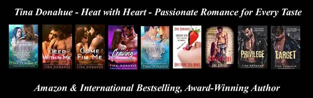 Tina’s an Amazon and international bestselling novelist who writes passionate romance for every taste – ‘heat with heart’ – for traditional publishers and indie. Booklist, Publisher’s Weekly, Romantic Times and numerous online sites have praised her work. She’s won Readers’ Choice Awards, was named a finalist in the EPIC competition, received a Book of the Year award, The Golden Nib Award, awards of merit in the RWA Holt Medallion competitions, and second place in the NEC RWA contests. She’s featured in the Novel & Short Story Writer’s Market. Before penning romances, she worked at a major Hollywood production company in Story Direction.