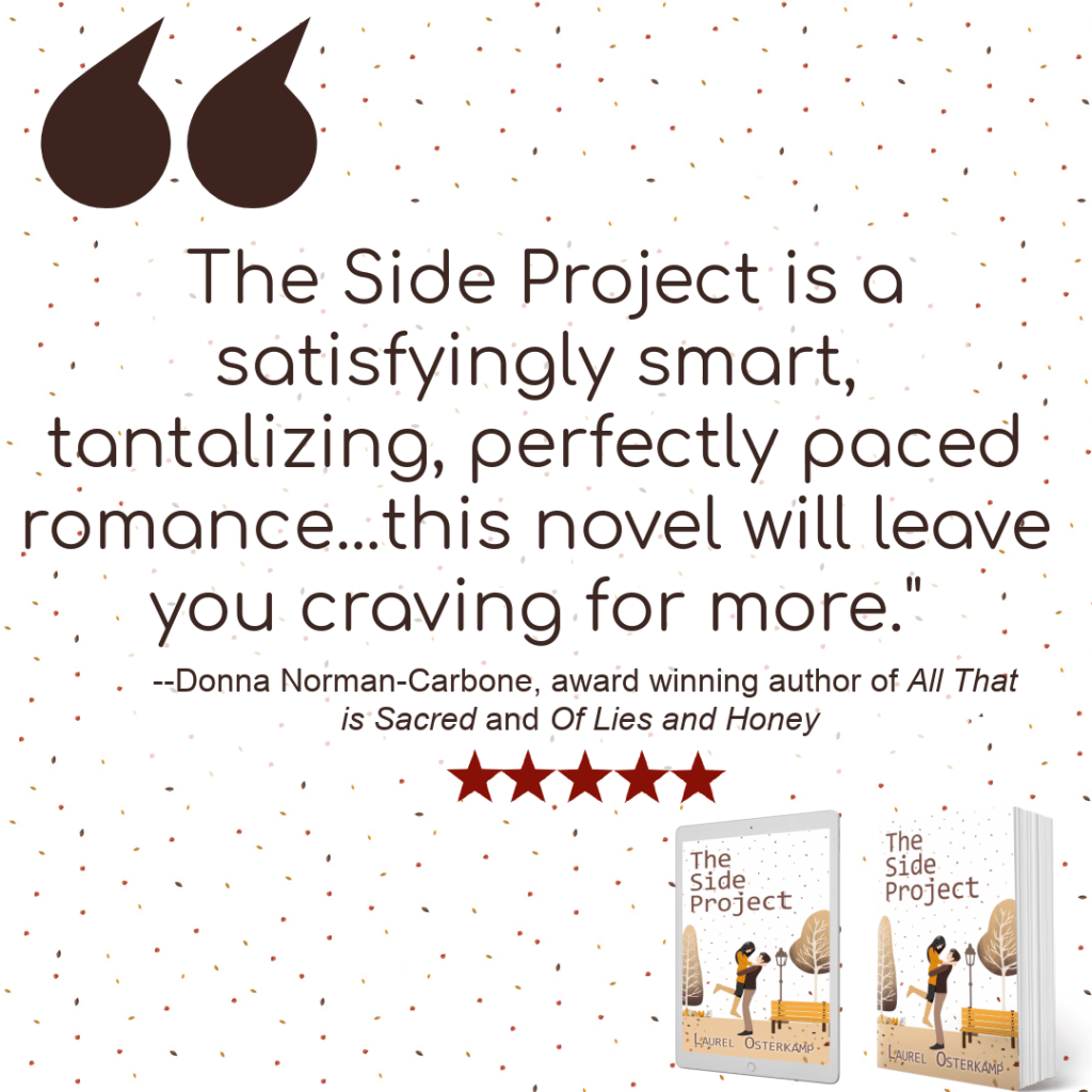 The Side Project is a second-chance, contemporary romance set in Bemidji, MN. It’s about two lonely dreamers who are thrown together by circumstance and begin a “no-strings-fling.” Of course, they end up falling in love, which is complicated for multiple reasons.